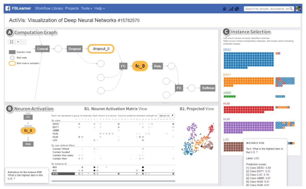 一个解决方案是神经网络模型的可视化,社交媒体巨头 Facebook 与 Georgia Tech 的研究人员正聚焦于这一方案。Facebook的深度学习用例并不限于图像分析,这意味着不同的数据类型被馈送到了模型中。不幸的是,用于神经网络可视化的大多数工具集中在图像数据集上,这激发了 Facebook 一款称为 ActiVis 的开发工具的研究,这是一个用于解释大规模神经网络模型和结果的交互式可视化系统。