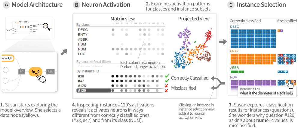 “ActiVis 将用户指定的实例或实例子集如何激活神经元进行可视化,以帮助用户了解模型如何生成其预测。用户可以自由地定义具有原始数据属性、变换特征和输出结果的子集,从多个角度实现模型检查。”