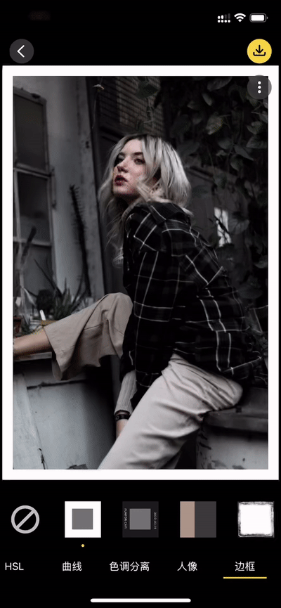 方弗相机具备添加相框的功能,包括白色、黑色、不规则的灰黑等多种相框,还有一种通过图片的主要颜色和次要颜色自动生成的背景相框。后续还会继续增加更多好看的相框。