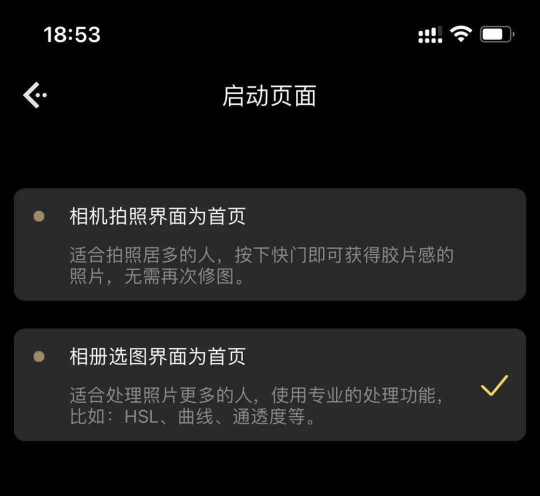 在 App 的设置页面,可以设置启动的默认功能,如果你更多的拿起手机拍个照片,可以选择默认打开相机,如果你更多的是修图,那就选择默认打开相册。