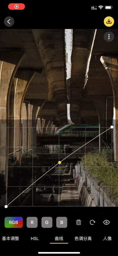 在「曲线」调整中,可以调整图像的整个色调范围内的点。最初,图像的色调在图形上表现为一条直的对角线。在调整 RGB 图像时,图形右上角区域代表高光,左下角区域代表阴影。共 4 条曲线可以调整,分别是 RGB、红、绿、蓝,每条曲线都可以自由调整,可以通过点击新增调节点,也可以选择某个调节点进行删除。
