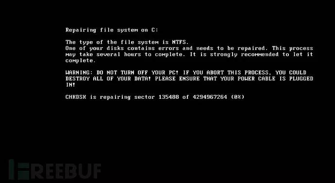 当系统重启后,执行病毒的MBR,伪装成CHKDSK进行加密磁盘,加密完成后弹出敲诈信息对用户进行敲诈。
