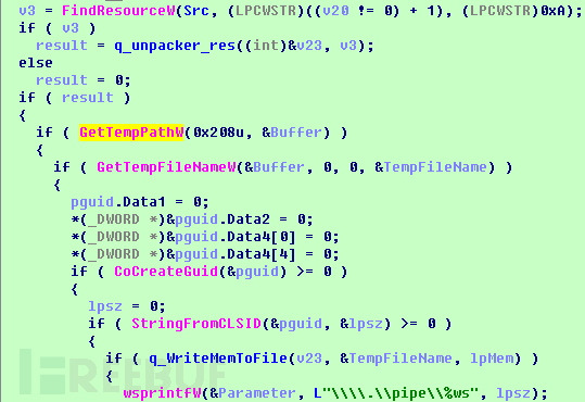进程首先从资源中解压缩ID为1的资源,在系统的%TEMP%目录下生成一个临时文件。