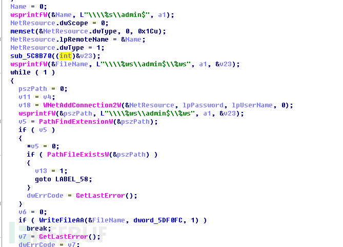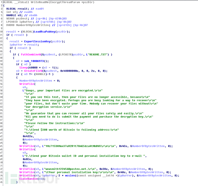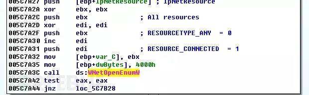 接下来修改磁盘的MBR,并将生成的Key,IV,比特币支付地址以及用户序列号写入磁盘的固定扇区。然后创建计划任务于1小时后重启。遍历局域网可以连通的ip列表,用于后续的局域网攻击。释放并执行抓取密码的进程,释放psexec进程用于后续执行远程命令。对系统的网络资源列表进行过滤,筛选本地保存的凭据,使用保存的凭据连接,成功后执行远程命令,进行局域网感染。