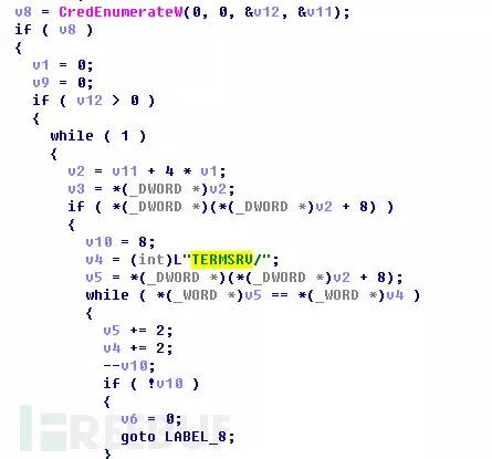 接下来,病毒遍历所有连接过的网络资源,从中筛选类型为TERMSRV的凭据保存。
