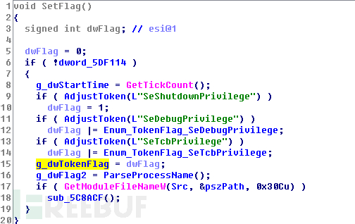 首先,Petya病毒会尝试提升当前进程的3种权限:SeShutdownPrivilege、SeDebugPrivilege和SeTcbPrivilege,根据是否成功设置标记,后面执行相应的流程时会判断此标记,以防没有权限时系统报错。