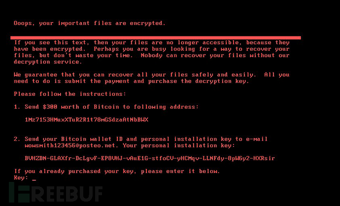 此次黑客使用的是Petya勒索病毒的变种,使用的传播攻击形式和WannaCry类似,但该病毒除了使用了永恒之蓝(MS17-010)漏洞,还罕见的使用了黑客的横向渗透攻击技术。在勒索技术方面与WannaCry等勒索软件不同之处在于,Petya木马主要通过加密硬盘驱动器主文件表(MFT),使主引导记录(MBR)不可操作,通过占用物理磁盘上的文件名、大小和位置的信息来限制对完整系统的访问,从而让电脑无法启动,故而其影响更加严重。如果想要恢复,需要支付价值相当于300美元的比特币。