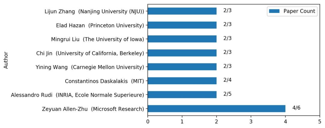 如果只看第一作者的话,排名第一的是微软的研究科学家朱泽园(Zeyuan Allen-Zhu),他作为第一作者所投的 6 篇论文中有 4 篇入选了本届 NIPS 大会,可谓高产。此外,南京大学计算机科学与技术系副教授张利军共有3篇论文被本次大会接收,其中作为一作的论文有2篇。