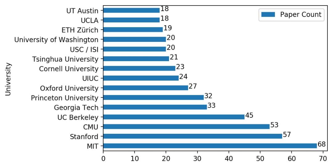 去年,卡耐基梅隆大学(CMU)曾以 48 篇论文成为了学界第一名,今年的前三位学校没变,顺序却有了变化:麻省理工学院(MIT)以 68 篇论文成为了学术机构的 NIPS 2018 接收论文数量第一名,紧随其后的是斯坦福大学和 CMU。在国内大学中,清华大学有 21 篇论文入选,排名第十位。