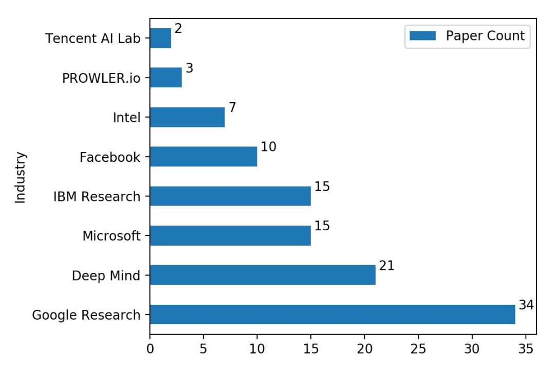 谷歌在人工智能方面的研究可谓一骑绝尘,它在 NIPS 2018 上的接收论文数量为 107 篇,竟占到了大会所有接收论文数量的 10.5%。这一数量相比去年的 60 篇又有了很大提升,看来其他公司目前还难以撼动它的位置。在谷歌之后是微软和 DeepMind,它们各自的贡献不到谷歌的一半。另一方面,腾讯 AI Lab 有 17 篇论文入选,CMU 邢波教授的创业公司 Petuum 也有 8 篇论文入选。
