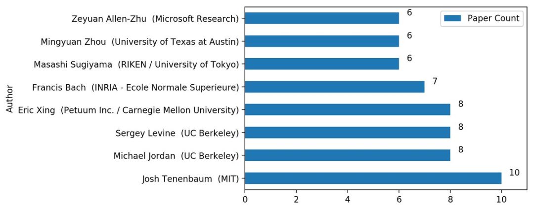 在个人统计中,几位著名学者占据了论文作者的前列。其中,来自 MIT 的脑科学和认知科学教授 Josh Tenenbaum 以 10 篇论文的数量成为第一。来自 UC Berkeley 的机器学习泰斗 Michael Jordan、UC Berkeley 教授 Sergey Levine,以及 CMU 教授邢波紧随其后,他们均有 8 篇论文入选。