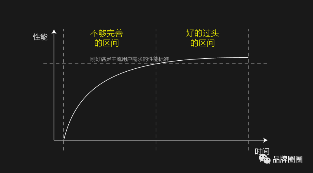 因为市场是有周期性的,每个市场都会从“不够完善”的产品市场区间,逐步发展到“好的过头”的产品市场区间。而最能凸显品牌价值的,是“不够完善”的产品市场区间。