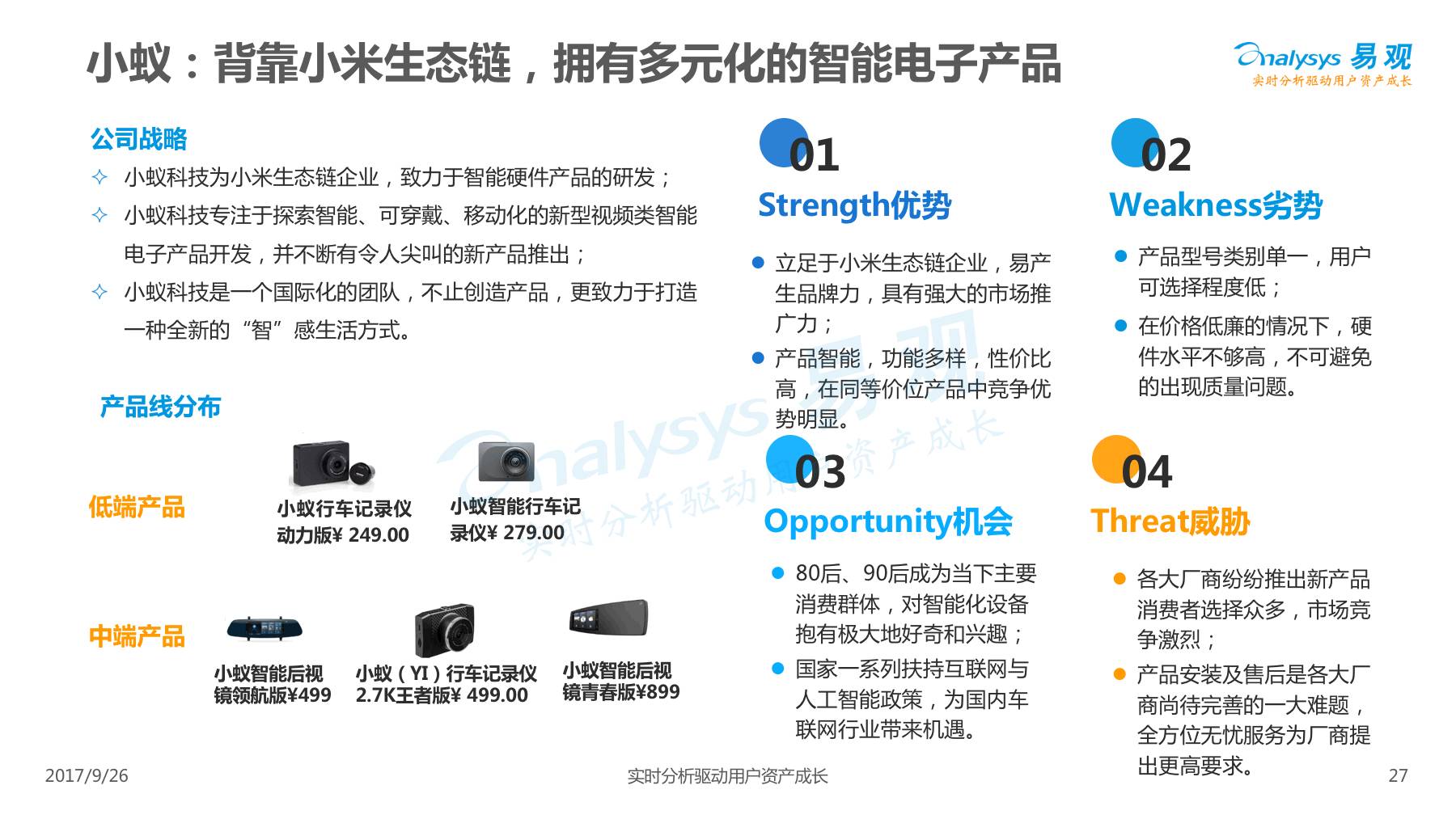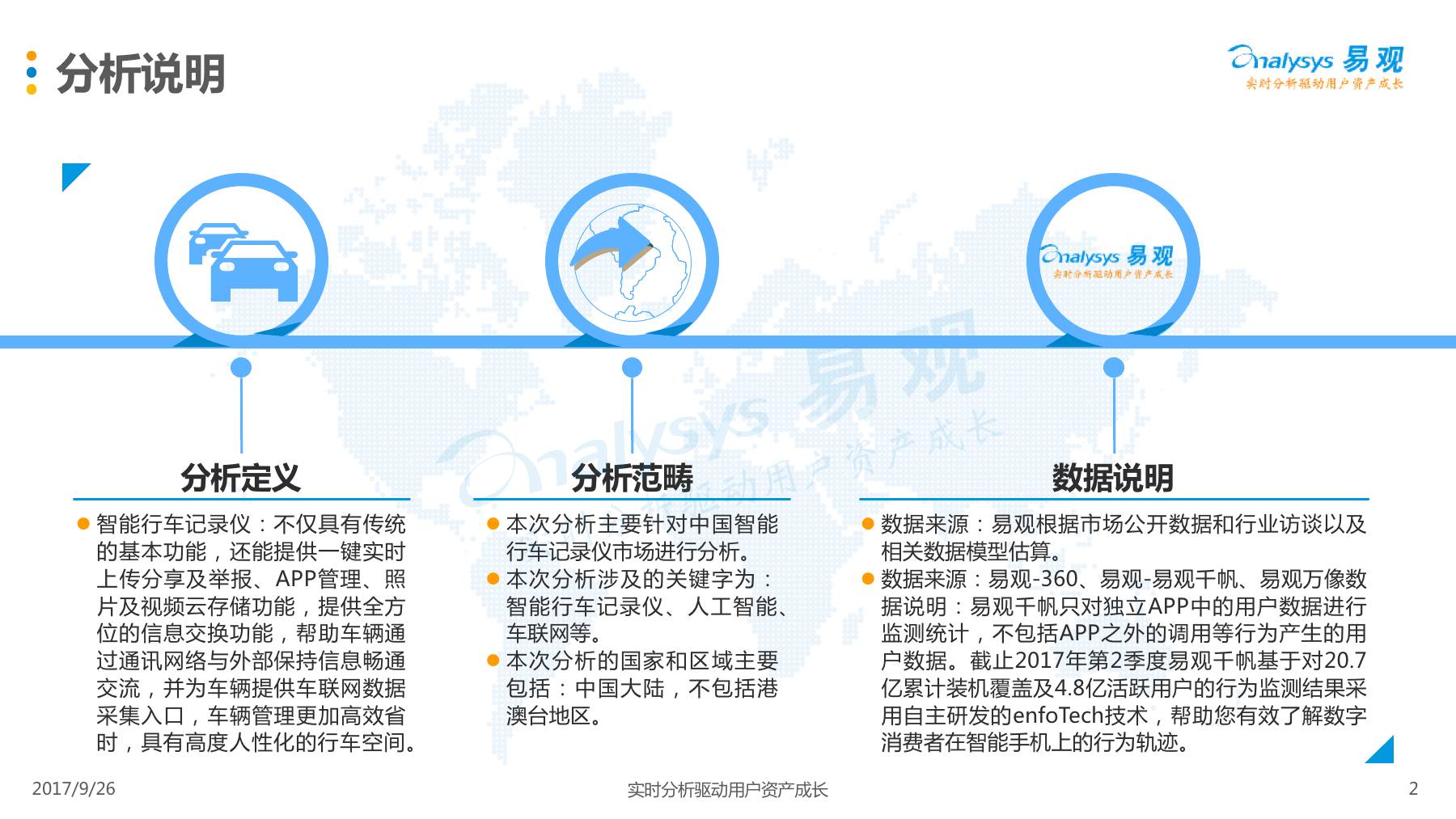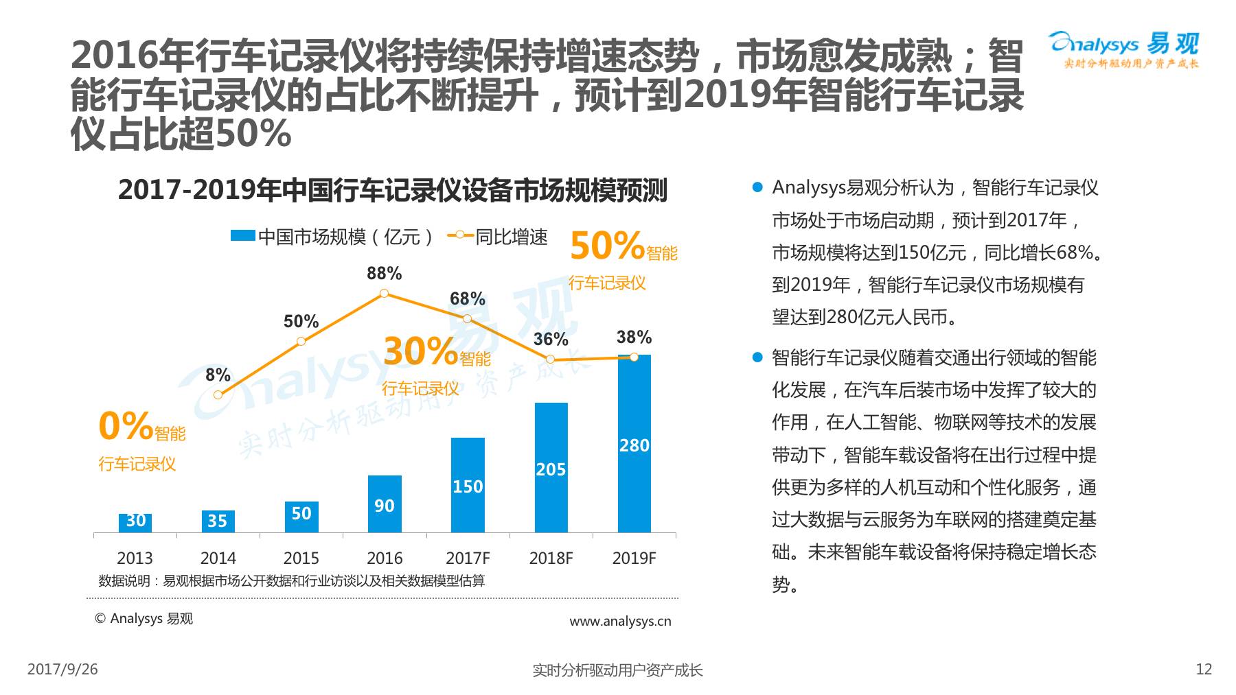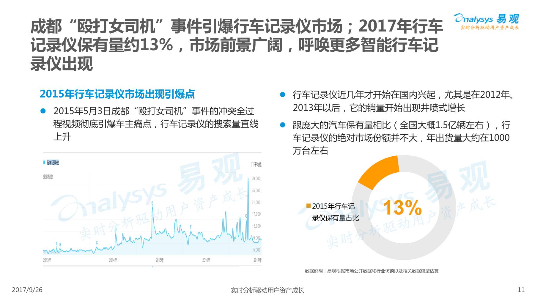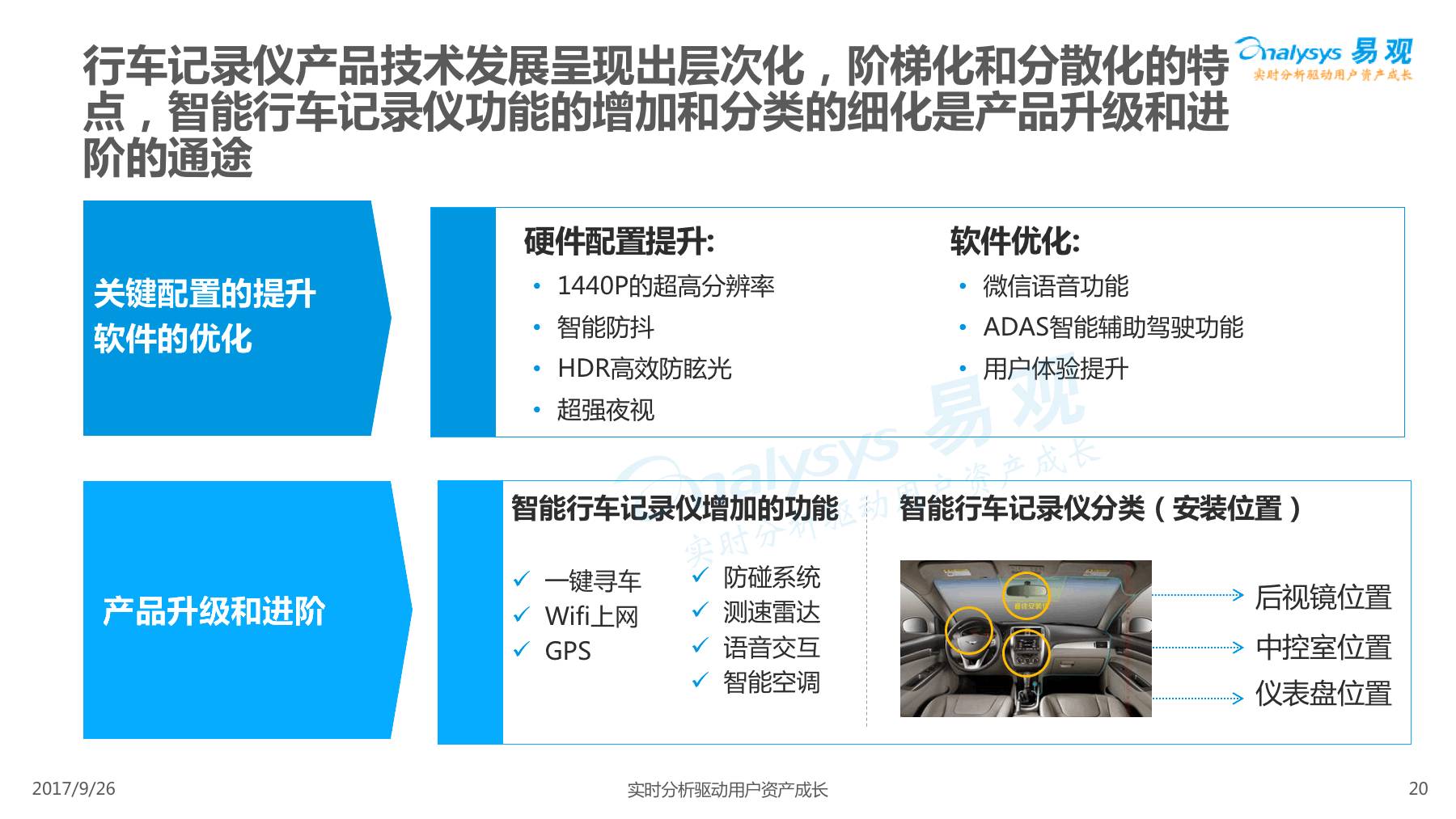行车记录仪产品经过一系列演进历程,产品形态越发丰富,产品功能越发智能,智能行车记录仪渐成主流,线上渠道是智能行车记录仪的主要销售渠道,进驻智能行车记录仪行业的企业驳杂,当前市场鱼龙混杂,主要可以划分为六大厂商类型。 本次分析主要针对中国智能行车记录仪市场进行分析,涉及到智能行车记录仪、人工智能、车联网等多个方面。