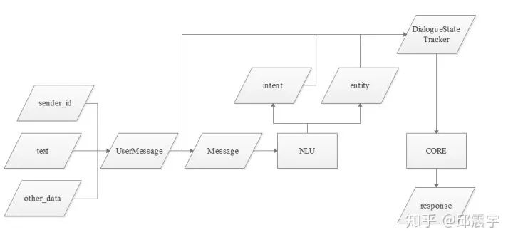 由图可知,当一条用户的表达到达chatbot时,由NLU对封装后的Message进行文本分析,得到意图和实体信息,然后由对话管理核心模块接受原始的用户消息和NLU的分析结果,根据一些策略,生成某个回复。