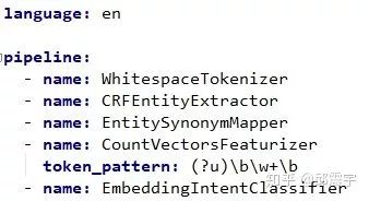 pipeline:有了组件之后,如何将组件按部就班,井然有序地拼装起来,并正常工作呢?因此就有了pipeline这个概念,其实在机器学习领域,pipeline这个概念已经存在很长时间了,它在很多框架中都有,比如大名鼎鼎的sklearn。使用pipeline的好处在于可以合理有序管理不同任务阶段的不同组件工具,当组件数量较多时,pipeline的好处就非常明显了。而在rasa中,pipeline的使用更为便捷,是通过yml配置文件实现。即开发者只需要定义好自己的组件,然后将组件配置在配置文件中就可以,即插即用。下图是一个简单的pipeline配置实例:
