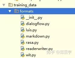 train方法。既然是使用条件随机场来进行实体抽取,那么就需要进行模型训练。因此需要定义train方法,来训练模型。关注train方法的两个参数training_data和config。其中,config就是之前提到的配置pipeline的配置文件的读取对象。training_data是TrainingData类型的对象。你可以将其类比于pytorch中的data_loader功能,它的主要作用是对训练数据进行封装,拆分训练集验证集,做数据校验等工作。说到这里,提一下rasa支持的原始训练数据的存放格式,主要支持markdown,wit,luis等文件格式,当然也可以提供json格式的数据。rasa如何读取这些格式的训练数据则是在如下代码包里定义: