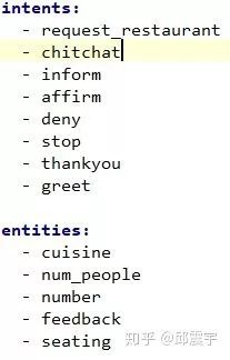 tips2:对于对话中,涉及到的所有intent和实体,均需要在配置文件中进行定义,方便各个组件在做相应的文本分析时进行lookup-table查找。这个配置文件叫domain.yml,一个简单的实例如下: