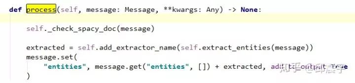 process方法。这个可以说是组件里面最重要的一个方法。当前面一通操作之后,只得到了模型,如何调用这个模型并处理文本,就是process方法的工作了。最后在message中增加一个dict,名为entities,用来存放提取的实体信息,包括实体的类型,实体的在文本中的start和end的位置信息等。