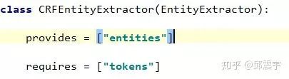 其次,每个component需要定义一个类变量provides和requires,分别表示这个组件所提供的中间成果和依赖的上游任务。对于CRFEntityExtractor来说,它提供了实体的抽取,同时为了进行实体抽取,需要先对文本进行分词,因此需要上游任务先完成tokenizer任务,提供tokens的中间成果。