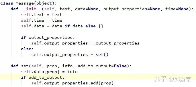message:在rasa中,用户发送到chatbot的所有对话内容,都需要被封装在一个对象中,这个对象就是Message.而在整个rasa工作流中,存在两个不同的message封装对象,一个是UserMessage,另一个是Message。其中UserMessage是最上层的封装对象,即直接接收用户从某个平台接口传送过来的消息。而Message则是当用户消息流到NLU模块时,将用户消息进行封装。关于UserMessage的内容在后面代码详解时会涉及到,这里先解释一下Message对象。看一下它的类部分定义,其实很简单,就是将用户的对话文本,以及时间进行封装,由于这个Message是贯穿整个NLU工作流的统一数据对象,因此还承载着记忆各个组件临时生成的中间结果(比如分词和词性标注的结果)以及最终得到的意图和实体信息。其中data存放的是意图和实体信息,在后续组件处理时,还会再Message中增加一些变量存储中间结果,即set成员方法的职责。