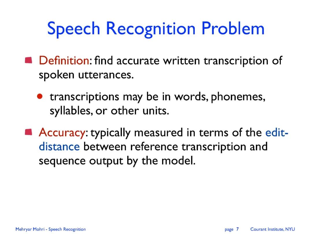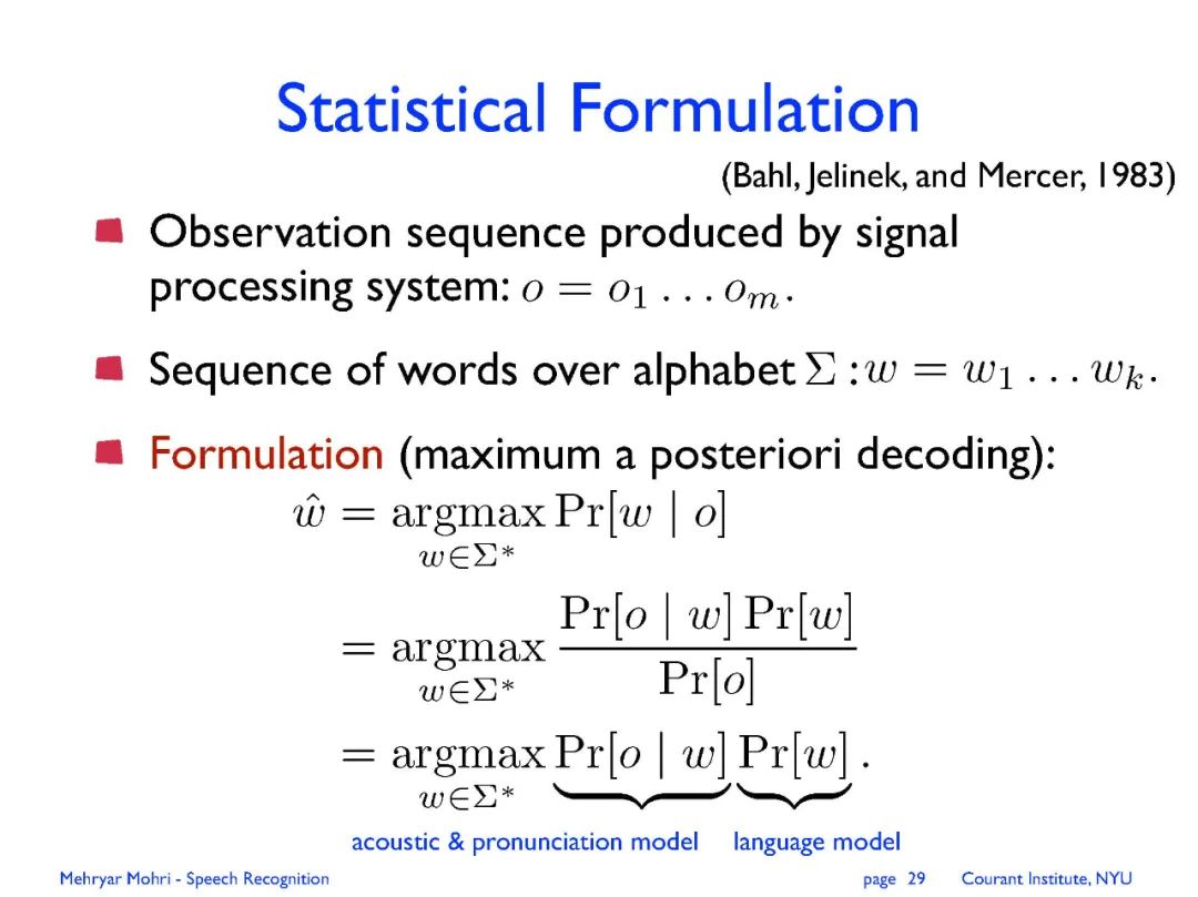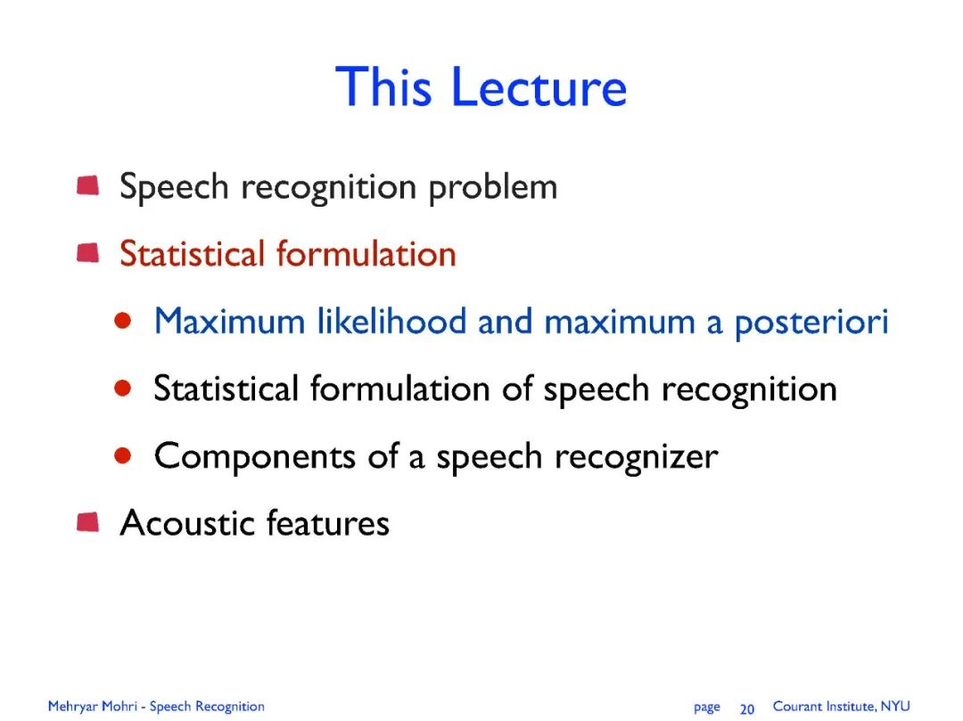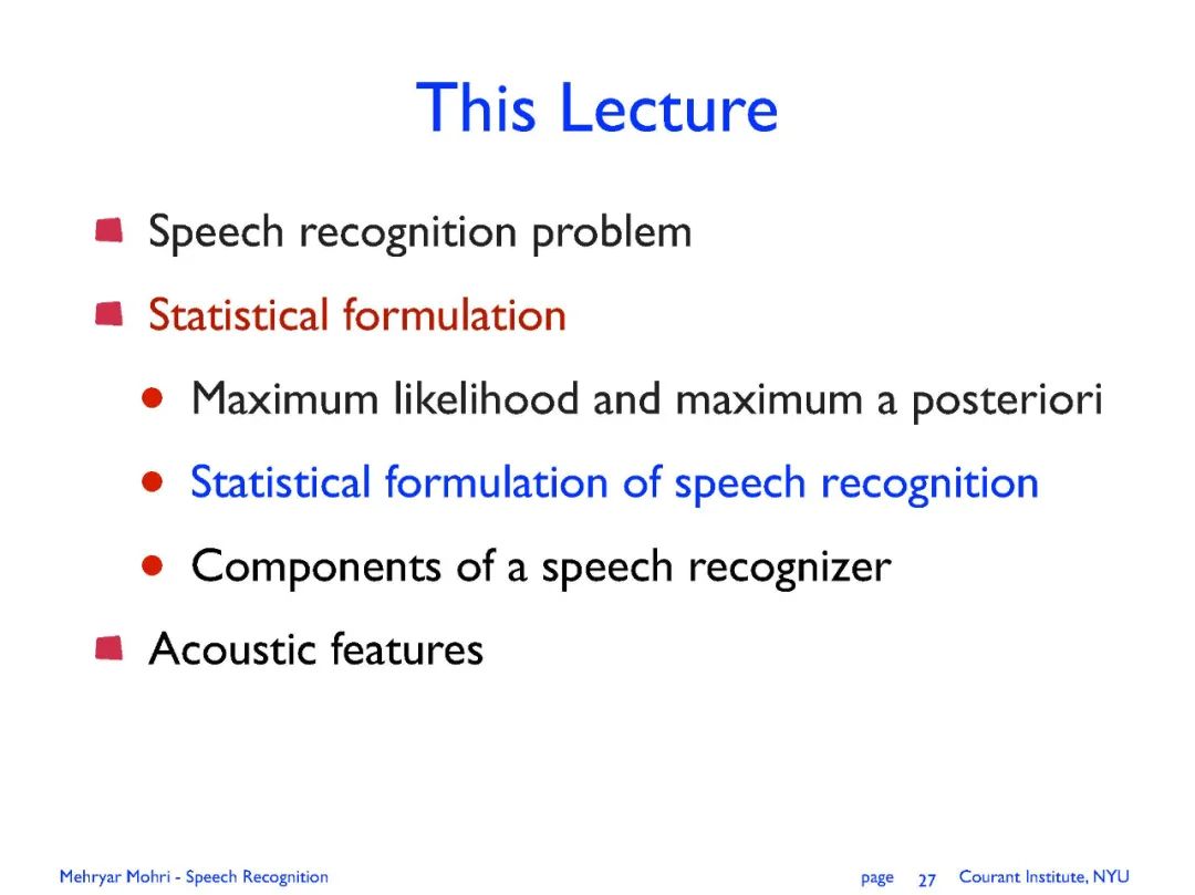 Lecture 01: introduction to speech recognition, statistical formulation.
