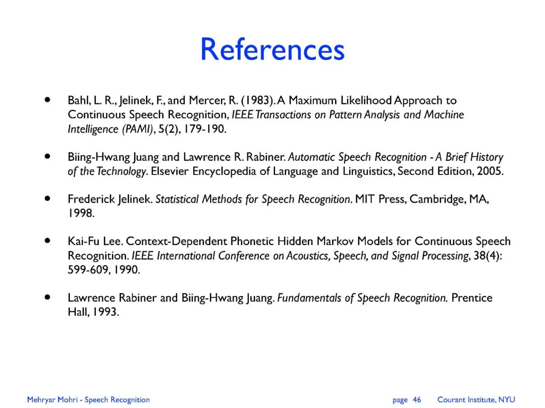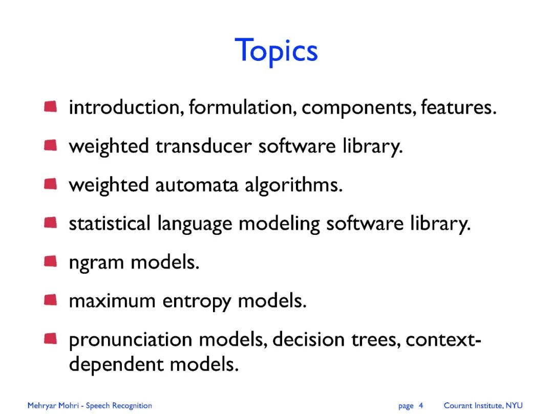 本课程以计算机科学的方式介绍自动语音识别,以及正确转录语音的问题。描述包括创建大规模语音识别系统的基本算法。所提出的算法和技术目前已在大多数研究和工业系统中得到应用。
