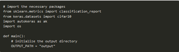 我们在第7行定义脚本的主要功能,由于Auto-Keras和TensorFlow处理线程的方式,我们需要将代码包装在main函数中。有关更多详细信息,请参阅此GitHub问题线程。