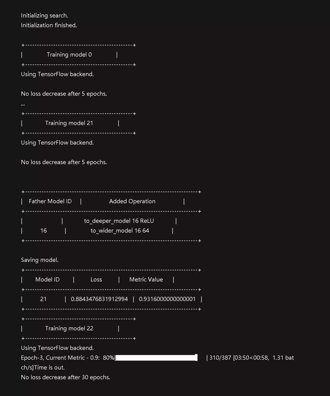 ·初始化我们的模型(AK.ImageClassifier),并让训练开始。请注意,我们并没有实例化一个特定对象的CNN类,我们也没有调整超参数。因为Auto-Keras会为我们处理所有这些。