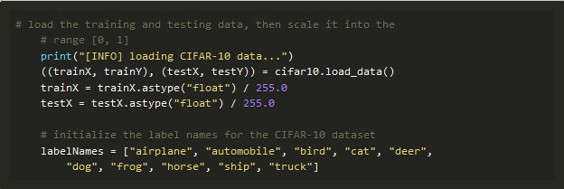 我们的CIFAR-10数据被加载并存储在第25行的训练/测试分组中。随后,我们将这个数据缩放到[0,1]的范围。接着我们会初始化我们的类labelNames,这10个类包含在CIFAR-10中。请注意,标签在这里很重要。