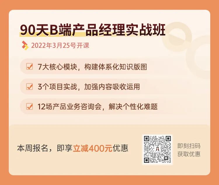 向你推荐《90天B端产品经理实战班》,带你掌握系统的B端产品工作方法,助你实现转岗&提升专业能力,实现涨薪小目标!