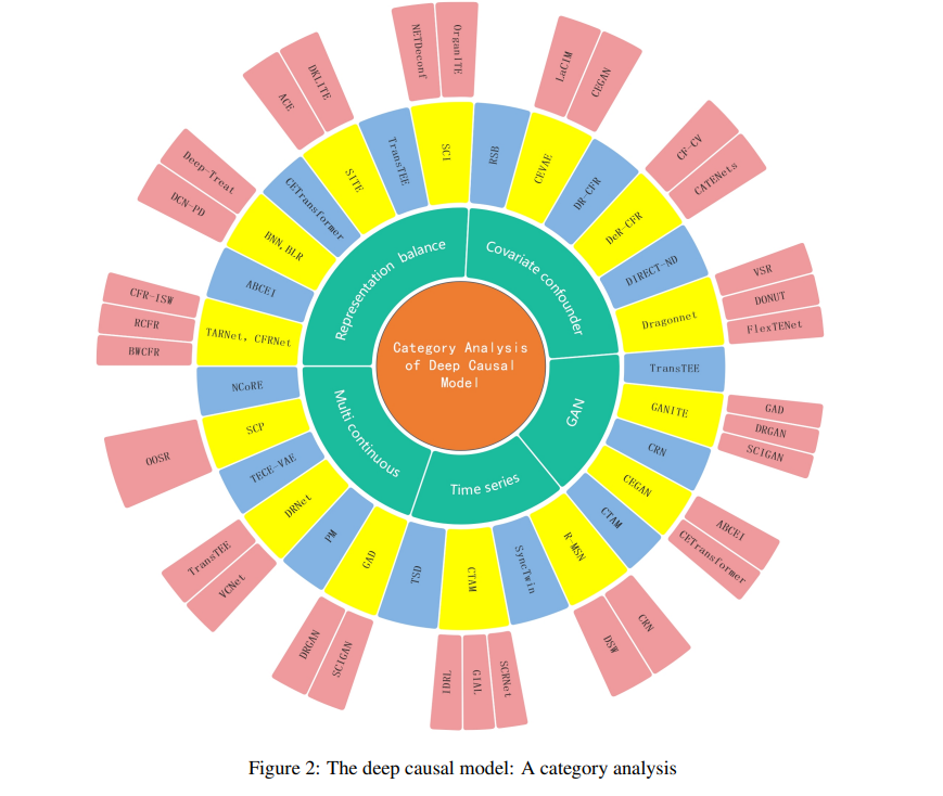 近年来,深入因果模型的研究越来越受欢迎。随着深度学习的发展,各种深度因果模型在估计因果效应方面变得更加准确和有效。根据图1,我们列出了2016年6月至2022年2月期间约40个经典的深度因果模型,包括它们的详细名称和提出时间。深度因果模型从2016年开始开发。Johansson等首次发表了反事实推理的学习表示[41],提出了算法框架BNN和BLR[41],将深度学习与因果效果估计问题相结合,将因果推理问题转化为领域适应问题。从那时起,许多模型被提出,包括DCN-PD[110], TARNet和CFRNet[43]。在这方面,需要注意的是,Louizos等人在2017年12月提出的基于深度网络经典结构参数自编码器VAE的CEVAE[54]模型,主要关注混杂因素及其对因果效应估计的影响。