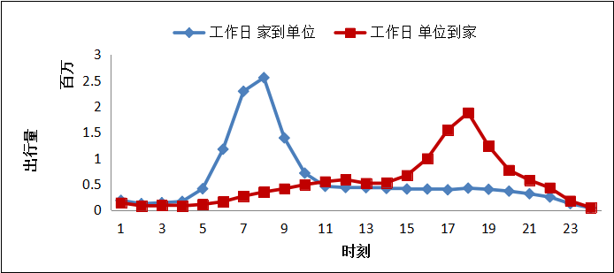 由于工作时间的固定性,北京市工作日通勤出行早晚高峰集中度高(如图3)。从通勤出行出发时间角度看,早6:00-9:00三个小时集中了从家到单位通勤出行的52%,晚16:00-20:00四个小时集中了从单位到家通勤出行的51%。早高峰时段,8:00通勤出行达到最高峰260万人次,晚高峰时段18:00达到最高峰190万人次。相比于晚高峰,早高峰通勤出行更为集中,出行量变化对时间的敏感度更高。