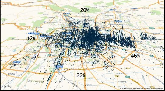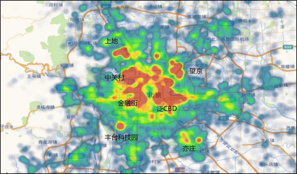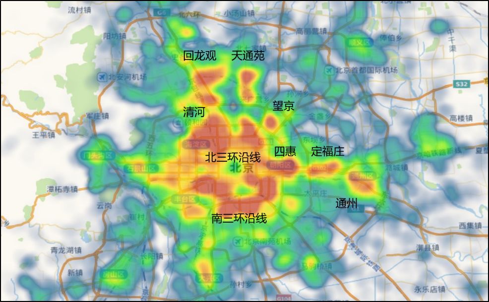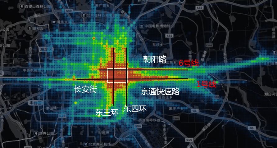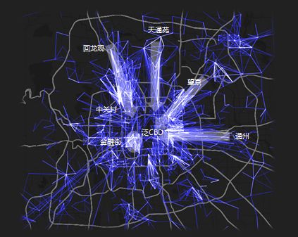 北京市连接职-住地之间的通勤期望线(图5)反映出,北京市有明显4大主要通勤方向:天通苑、望京、通州到东三环附近泛CBD区域,以及回龙观到中关村区域。由此可见,泛CBD区域作为北京市的岗位核心区,吸引了4大方向中3个方向的主要通勤人口,具有十分重要的城市及交通地位。