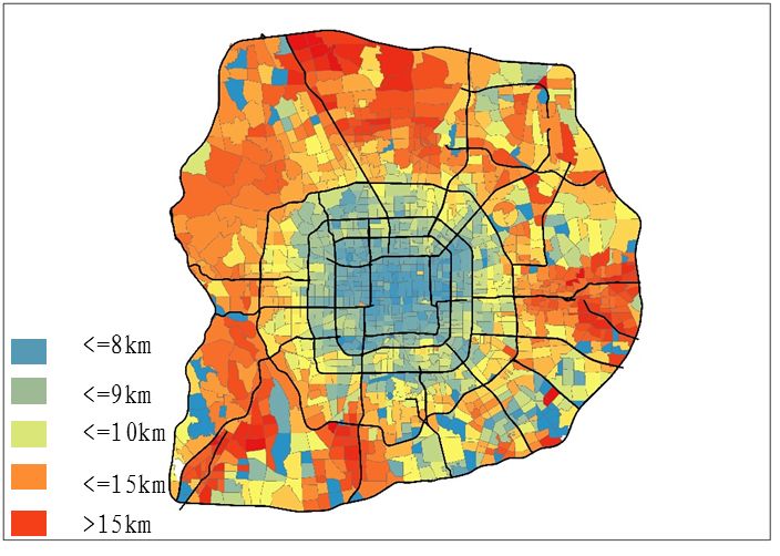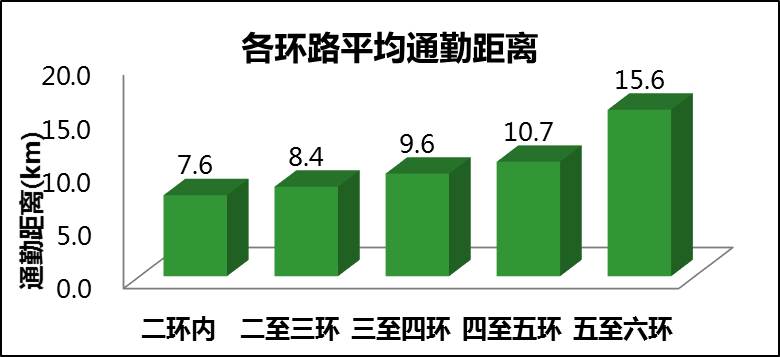 通勤出行是指以上下班、上下学为目的的出行,具有时空规律性强,刚性大的特点。北京市六环内通勤出行量日均2300万,占出行总量的52%,平均通勤距离12.4km,平均通勤时耗56min。以通勤距离度量北京市职住分离度,从二环到六环,职住分离度逐渐增大,五-六环间平均通勤距离高达15.6km(图1);快速路、高速公路沿线通勤距离更长(图2),五环外京藏、京通快速路、京港澳、京开沿线通勤距离均大于15km。