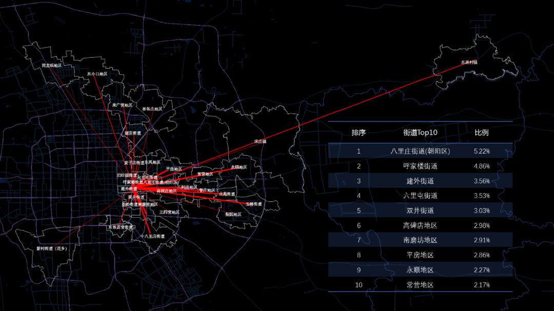 早高峰CBD出行量112万人次,占全天总出行量的39%(全天出行量290万人次)。其中,吸引区域外出行量32万人次,发生出行量12万人次,内部出行2万人次。早高峰CBD吸引的出行以东部最为集中(图7),占比高达46%,主要是吸引了四惠、定福庄、通州城区及燕郊等地的通勤者。其次为南部区域(22%)与北部区域(20%),主要是天通苑、望京、方庄、宋家庄等地的通勤者。从街道粒度来看,早高峰CBD吸引街道TOP10分别为八里庄、呼家楼、建外、六里屯、双井、高碑店、南磨房、平方、永顺和常营街道(图8)。