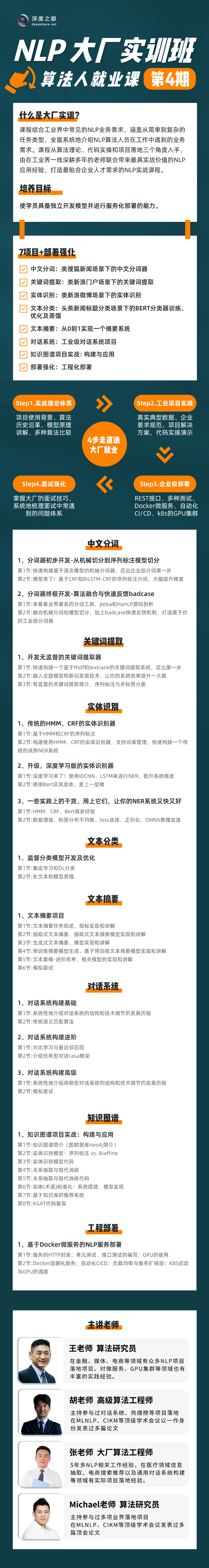 如果你觉得这些开源项目量级不够或者自己学起来吃力,我推荐你参加深度之眼的NLP大厂实训班,一线算法工程师带你学习常见NLP项目。