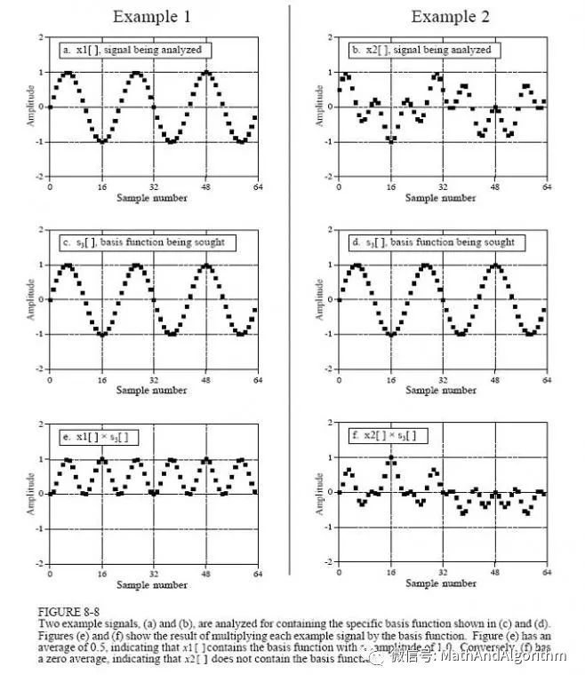 利用第一种方法、信号的相关性(correlation)可以从噪声背景中检测出已知的信号,我们也可以利用这个方法检测信号波中是否含有某个频率的信号波:把一个待检测信号波乘以另一个信号波,得到一个新的信号波,再把这个新的信号波所有的点进行相加,从相加的结果就可以判断出这两个信号的相似程度。如下图: