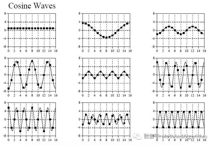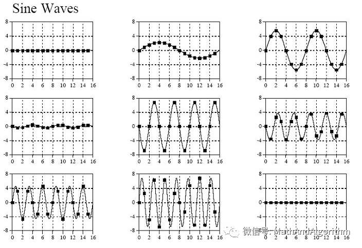 这个信号的长度是16,于是可以把这个信号分解9个余弦波和9个正弦波(一个长度为N的信号可以分解成N/2+1个正余弦信号,这是为什么呢?结合下面的18个正余弦图,我想从计算机处理精度上就不难理解,一个长度为N的信号,最多只能有N/2+1个不同频率,再多的频率就超过了计算机所能所处理的精度范围),如下图: