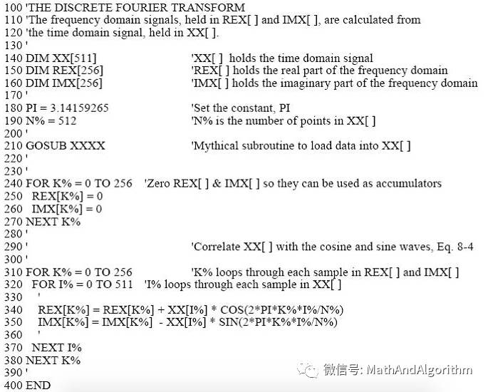 450 XX[I%] = XX[I%] + REX[K%] * COS(2 * PI * K% * I% / N%)