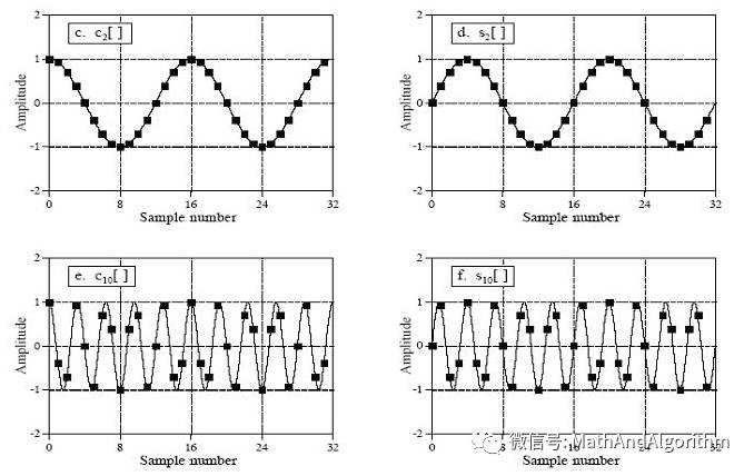有三种完全不同的方法进行DFT:一种方法是通过联立方程进行求解, 从代数的角度看,要从N个已知值求N个未知值,需要N个联立方程,且N个联立方程必须是线性独立的,但这是这种方法计算量非常的大且极其复杂,所以很少被采用;第二种方法是利用信号的相关性(correlation)进行计算,这个是我们后面将要介绍的方法;第三种方法是快速傅立叶变换(FFT),这是一个非常具有创造性和革命性的的方法,因为它大大提高了运算速度,使得傅立叶变换能够在计算机中被广泛应用,但这种算法是根据复数形式的傅立叶变换来实现的,它把N个点的信号分解成长度为N的频域,这个跟我们现在所进行的实域DFT变换不一样,而且这种方法也较难理解,这里我们先不去理解,等先理解了复数DFT后,再来看一下FFT。有一点很重要,那就是这三种方法所得的变换结果是一样的,经过实践证明,当频域长度为32时,利用相关性方法进行计算效率最好,否则FFT算法效率较高。现在就让我们来看一下相关性算法。
