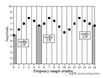 这是一个频谱图,横坐标表示频率大小,纵坐标表示振幅大小,原始信号长度为N(这里是32),经DFT转换后得到的17个频率的频谱,频谱密度表示每单位带宽中为多大的振幅,那么带宽是怎么计算出来的呢?看上图,除了头尾两个,其余点的所占的宽度是2/N,这个宽度便是每个点的带宽,头尾两个点的带宽是1/N,而Im X[k]和Re X[k]表示的是频谱密度,即每一个单位带宽的振幅大小,但表示2/N(或1/N)带宽的振幅大小,所以