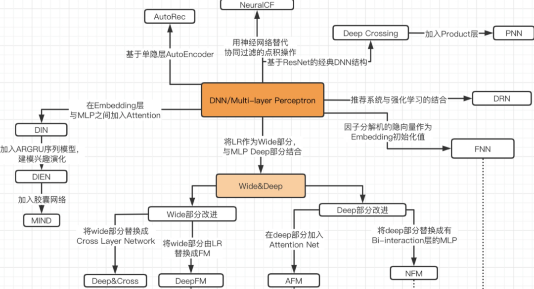 如下图所示,最近几年,广告推荐搜索领域的算法推陈出新,我们作为小团队也尝试过其中几种方法,也取得了一定效果。