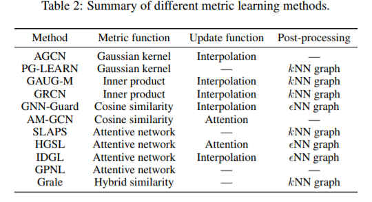 结构建模。GSL的核心是一个编码函数,它对最优图结构A*用边权值表示。编码函数可以通过两两距离或可学习参数来定义边缘权值。在本研究中,我们将现有的研究分为以下三组: