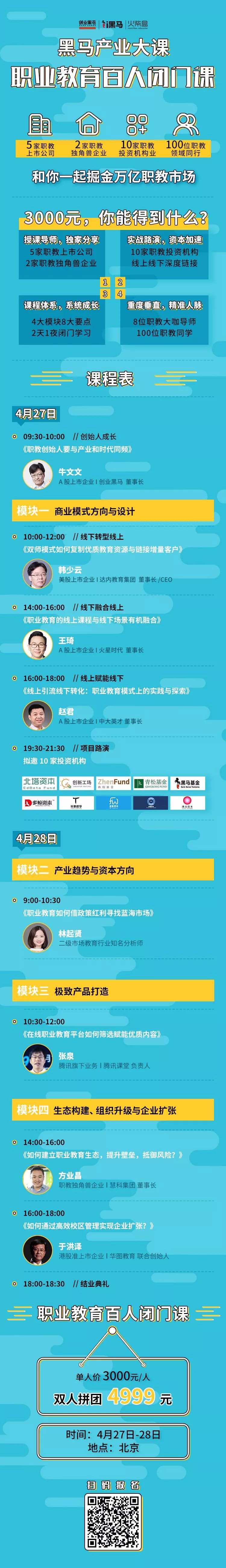 面对时代的大潮,创业黑马联合职业教育行业大咖,定于4月27日-28日举办“职业教育·百人闭门课”,一起掘金万亿职教市场,一起触摸教育产业未来!