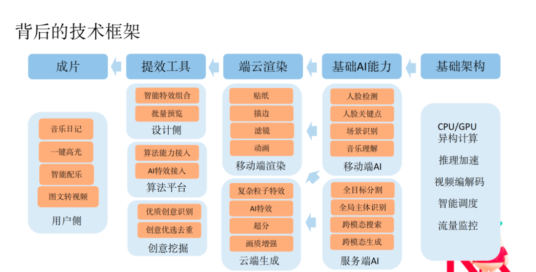 为了实现更好的辅助创作效果,小红书技术团队打造了一条比较复杂的技术链路,从基础架构、基础 AI 能力到端云协同的操作。此外,为了跟设计师有很好的协同,团队还做了大量提效工具,让设计师和 AI 的合作更加密切,更好地还原亮点效果,支撑各种各样的上游应用场景。