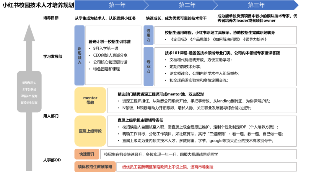 此外,对于优秀的应届毕业生,小红书从人才培养机制上进行了精心的设置,包括从融入职场到成长为行业技术人才全周期的的详细培养方案。