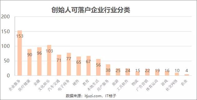 我们发现,同「创始人及核心成员落户企业行业分类」一样,企业服务领域企业的数量依然是最多的,共计有 95 家,远超排名第二的医疗健康领域企业。