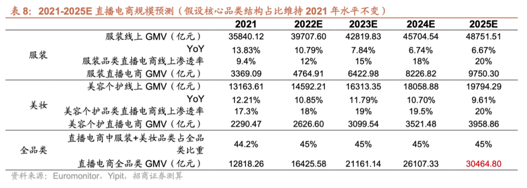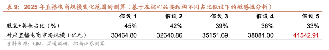 综上,招商证券基于这两大品类未来的线上化率、直播电商的销售占比、两大品类直播电商线上市占率进行假设,对2025年直播电商的规模进行测算。