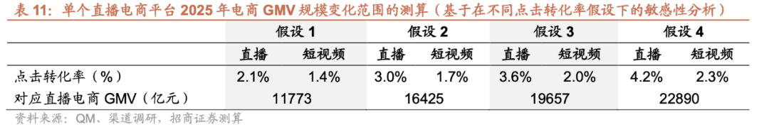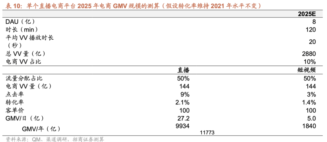 当转化率维持2021年直播2.1%,短视频1.4%的平均水平时,2025年单个直播电商平台的GMV将达11773亿元;