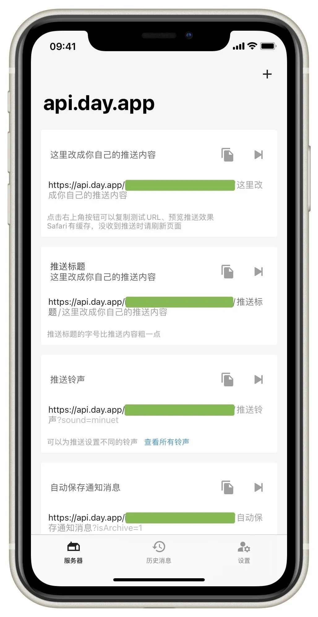 第一次打开 Bark App 时,会自动为你的设备生成 key ,复制 App 首页自动生成的第一个带有 key 参数的 URL 备用。